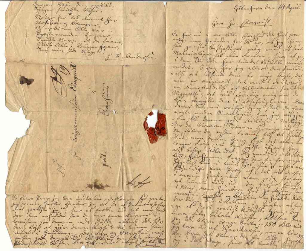 Gulnet og noget laset er det unægtelig, men den gotiske skrift står endnu tydeligt på papiret. Det er skrevet før frimærkernes og kuverternes tid, foldet omhyggeligt sammen og forseglet med lak, hvoraf endnu en stump sidder tilbage. Ved siden af adressen har Andersen skrevet “frit”, hvoraf det fremgår, at afsenderen har betalt portoen. Min far, som var dygtigere end jeg til at læse gotisk håndskrift (og Andersens er ikke let at dechiffrere), har med pertentlig omhu skrevet brevet af, og denne afskrift betjener jeg mig af i det følgende, men jeg tør stå inde for, at ikke en tøddel er forandret.