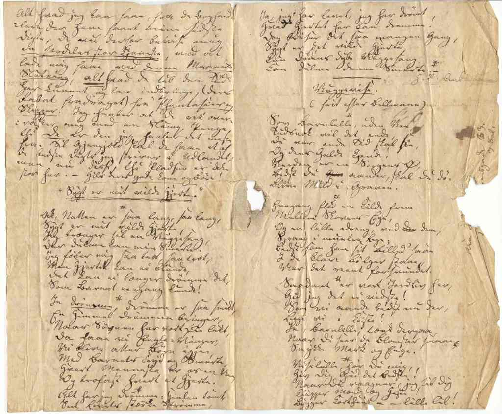 De har nu i en lille Evighed ikke hørt fra mig, men Grunden her til er, at jeg har saa ganske beskjæftiget mig med at samle Materialer til min Roman, saa at jeg i den Tid ikke har kunnet bestille andet. I Dag har jeg ellers den Fornøielse at tilsende Dem to nye Digte, det ene er originalt, det andet derimod en Bearbejdelse af Bellmanns smukke Vuggevise; det vil fornøie mig om De kan benytte dem i Læsefrugterne. – Når Deres Søn nu reiser hjem skal De faae nogle andre Smaasager, som jeg vil gjemme til denne gode Lejlighed. Nu begynder da Vaaren, Træerne springe ud, og jeg føler da ogsaa Trang til at springe med, men denne Gang skal det være en længere Reise end den jydske ifjor; jeg vil besøge Udlandet. Jeg maa ud i Verden lidt; her hjemme sniger der sig formeget Sygeligt ind i min Sjæl, som jo også mine sidste Digte bære Præg af; det vil derfor i mange Henseende være godt for mig at komme lidt ud. Jeg reiser først i Mai, over Hamborg til Hartzen, seer maaske Kassel og Berliin og smukke Stæder der ligge der imellem, og haaber at bringe et stort poetisk Udbytte hjem. Jeg maa selv betale Reisen, altsaa kan jeg ikke blive længe borte. 150 Rdlr vil jeg tage ud af Sparekassen, mere tør jeg ikke, men det bliver da for lidt, hvorfor jeg i disse Dage, seer at trække ind Alt hvad jeg kan faae, fra de Boghandlere der have faaet mine sidste Digte; De vil derfor bevise mig en særdeles stor Tjeneste ved at lade mig faae ved denne Maaneds Slutning, alt hvad De til den Tid har kunnet og kan indbringe (Deres Rabat fradraget) fra “Phantasier og Skizzer”. Jeg haaber at De ret overrasker mig med en Slump Penge, thi De er den jeg haaber det meste fra. Til Gjengæld skal De faae et af de bedste Digte jeg skriver i Udlandet, men nu disse, thi Pladsen er ikke stor her. – Hils Deres gode Kone og Børn.!