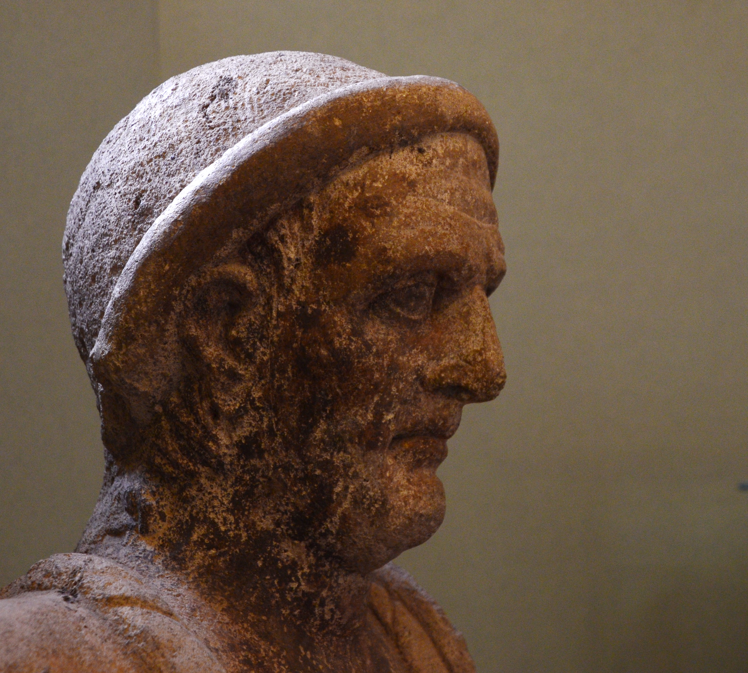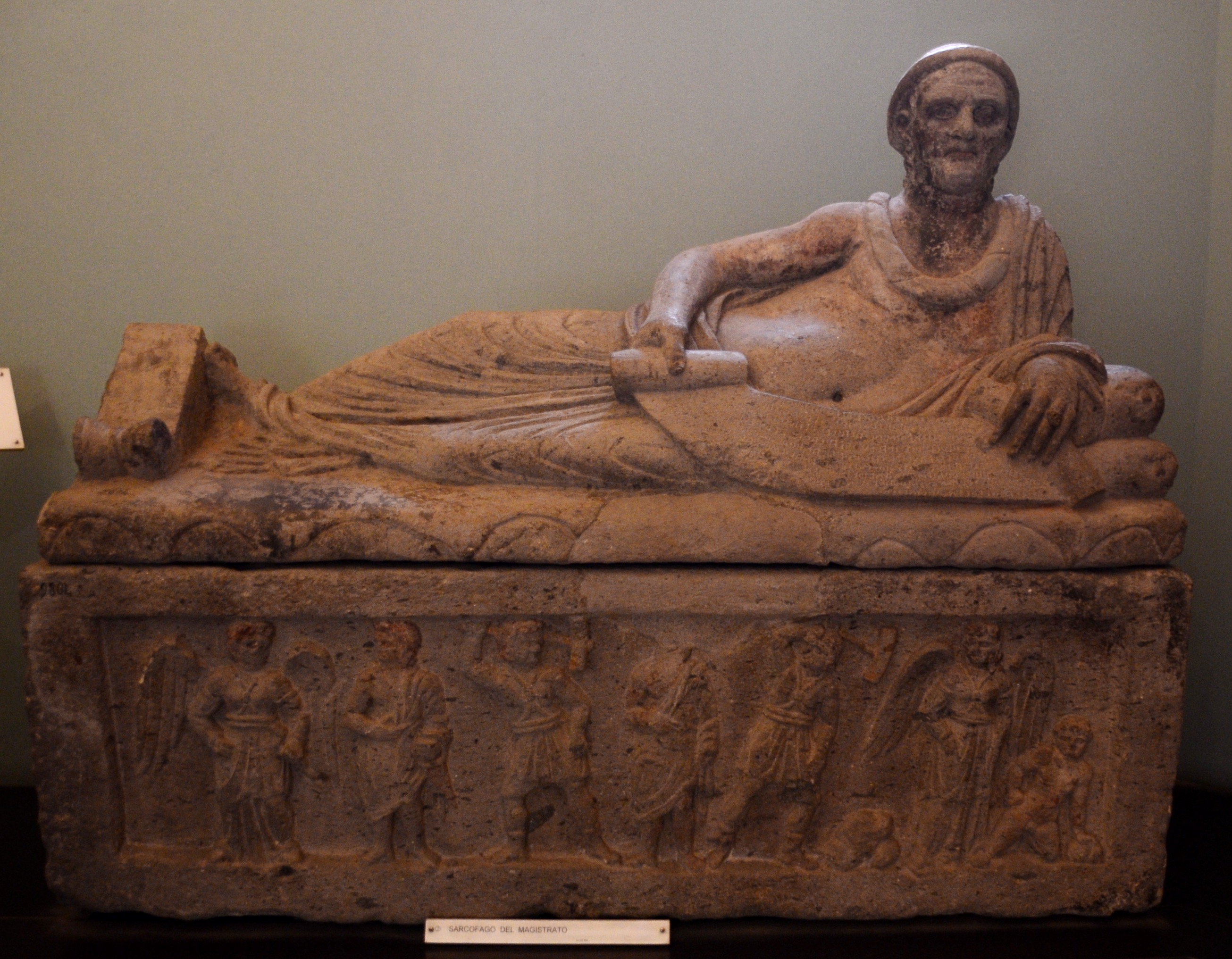 D.H. Lawrence wrote in “Etruscan Places” sketches of Cerveteri and Tarquinia. His description of what he saw in the museum in Tarquinia could have been written yesterday. Nothing seems to have changed. The statue of the reclining magistrate remains as lively as ever. He holds a large scroll with an Etruscan inscription which, unfortunately, we cannot completely decipher. Writing is with mostly Greek letters, alternating between left-to-right and right-to-left.